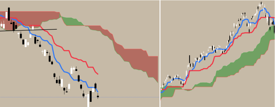 TK (Tenkan Kijun) crosses is another set of signals to look for which help assist E2E plays by giving you an earlier signal to notify of potential cloud entries or cloud pattern continuations and exhaustions. On the example to the right side above us you’ll notice that prior to the bullish “End to End” play you see a bullish TK. A TK cross prior to a cloud setup can be a signs of trend starting and giving more probability that your E2E play will work out. Typically when the price is going up the support line is the Kijun with the price action is above it and over a green cloud. When the price is going down the Kijun now acts are resistance with the price below it and a red cloud above. (see example below) After a TK cross has been going in its direction for a good amount as shown below, that’s when you want to start searching for potential E2E play structures.