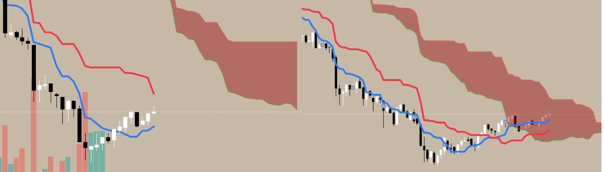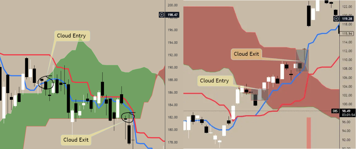 Lets start with one of the simplest setups to look for which is the E2E (End To End) play, this is when the price enters into the cloud from either the top or bottom and goes to the opposite side.(see example below) The key is to look for cloud structures in which the price getting ready to potentially enter a sufficiently sized cloud after a recent price decline or increase. Cloud entries like this give you higher probability to decide if the current trend is going to potentially turn around from being bearish to bullish or vice versa. It not always a guarantee that the after the E2E play you see it follow thru so assessing your risk is important based off your entry . Typically I cut part of the position after the end to end play is complete.